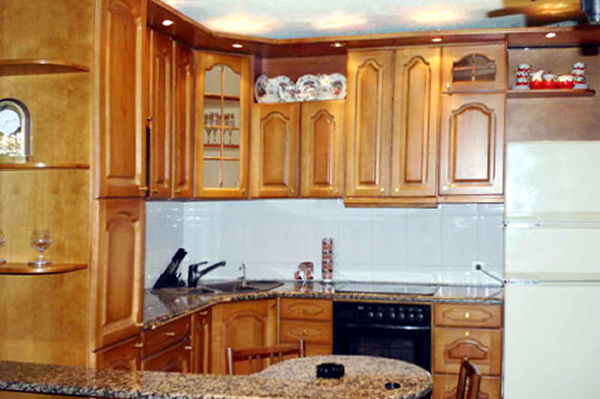 A kitchen with all equipment at the apartment: refrigerator, microwave oven, dishes, teapot, etc.